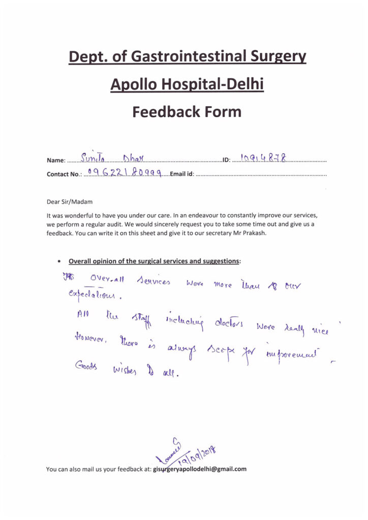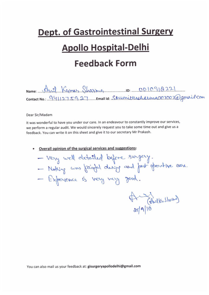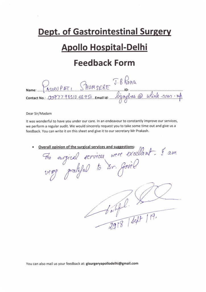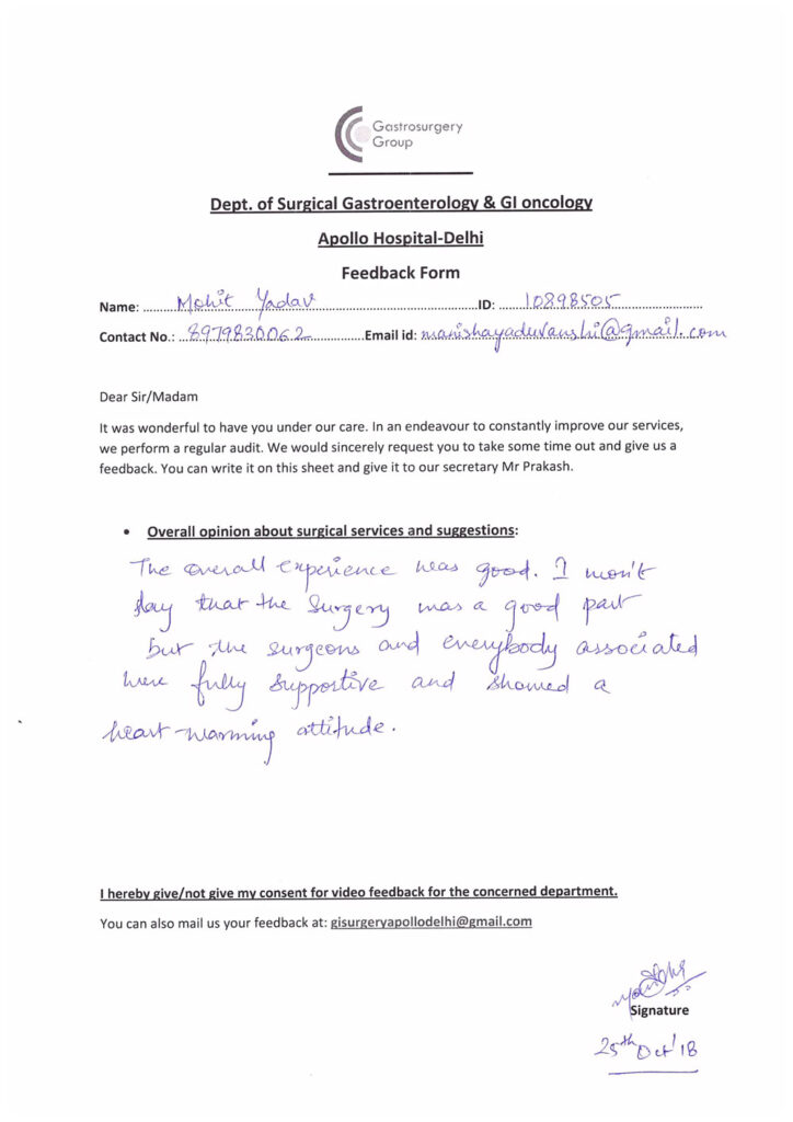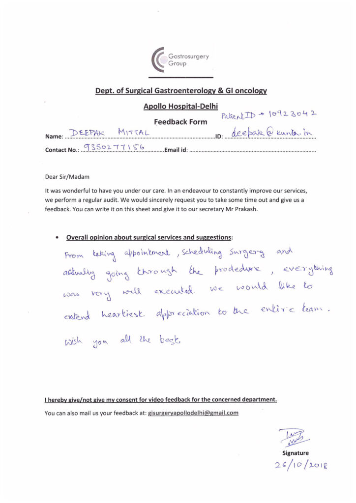 My experience with Dr. Govil & his team was excellent, my wife went for Gallbladder operation & discharged next day comfortably. I was fully satisfied with his treatment & behaviour…..Neeraj
