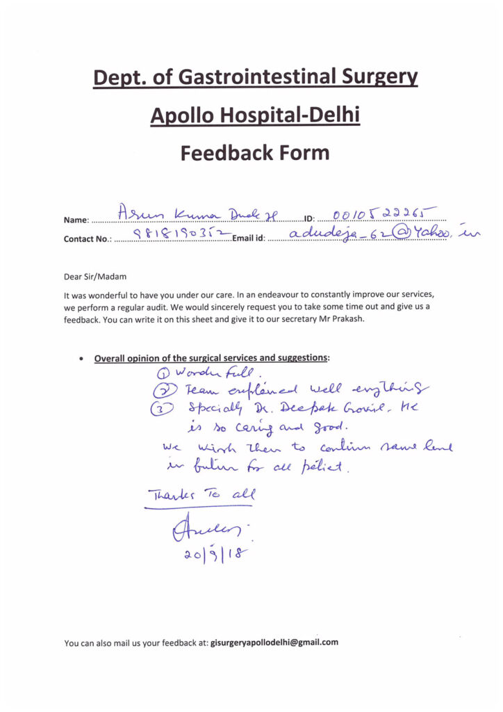 Deepak givil l and his team done good job. When I came here I was in bad condition but Dr Govil treats very well . Now I am fit and fine. Now I am alright and happy . Thanks to Dr givil and team.